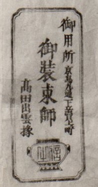 江戸時代以前の髙田家資料については、天保六年(1835)に宮廷よりいただいた「髙田出雲掾受領口宣案」という任官の辞令書や皇女和宮御装束控裂(ひかえぎれ 見本の生地)など多数のものが残っております。有栖川宮家の資料の中に髙田家が後水尾天皇(1596-1680)や霊元天皇(1654-1732)に装束を調進した記録があり、その他の公家の日記の中にも登場しております。また元禄十四年(1701)には初めて出雲掾(いづものじょう)の位をいただきました。